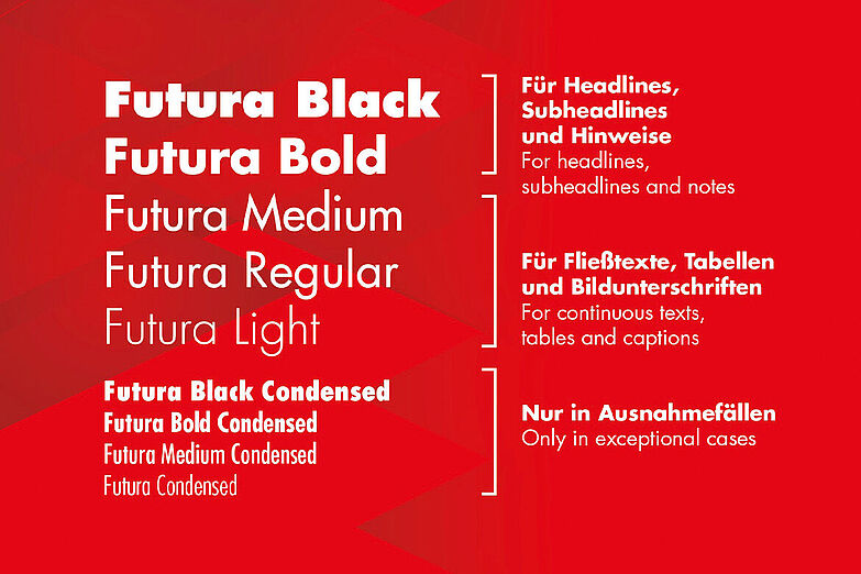Unsere Hausschrift ist Futura Next. Deren typografische Ausrichtung wirkt sowohl plakativ als auch geradlinig und seriös. Unsere Hausschrift unterstützt mit ihren verschiedenen Schriftschnitten (Regular, Medium, Bold etc.) den vielfältigen Charakter unserer Marke.